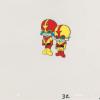 A production cel from the Hanna Barbera Studios animated series “Teen Force” (1981). Featuring the Astro-Mites Glax and Plutem, the hand-painted cel was created at the studio and used during the animation process. The piece is an actual frame of animation that was photographed and appears in the cartoon. Measuring 10.5"x12.5" overall, with the character image measuring 2.5"x2", the production cel is in fair condition with spots of paint loss throughout.